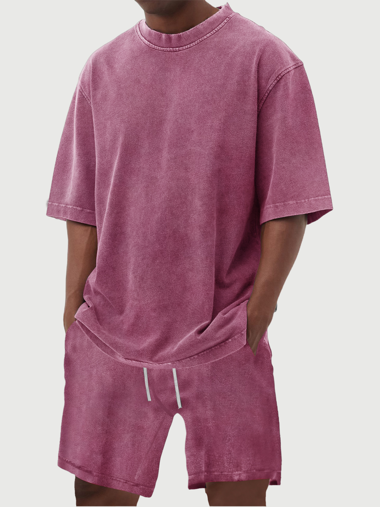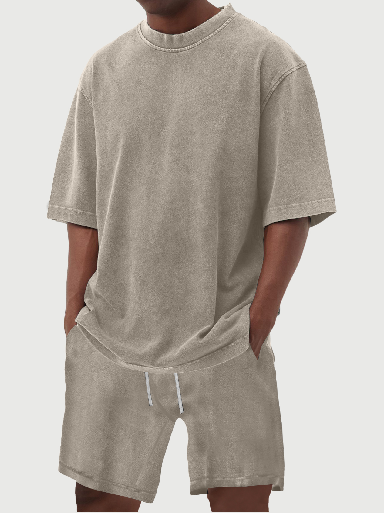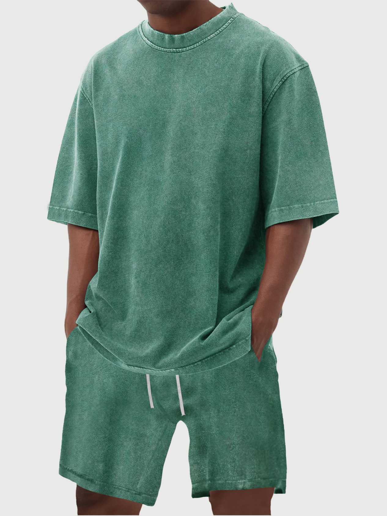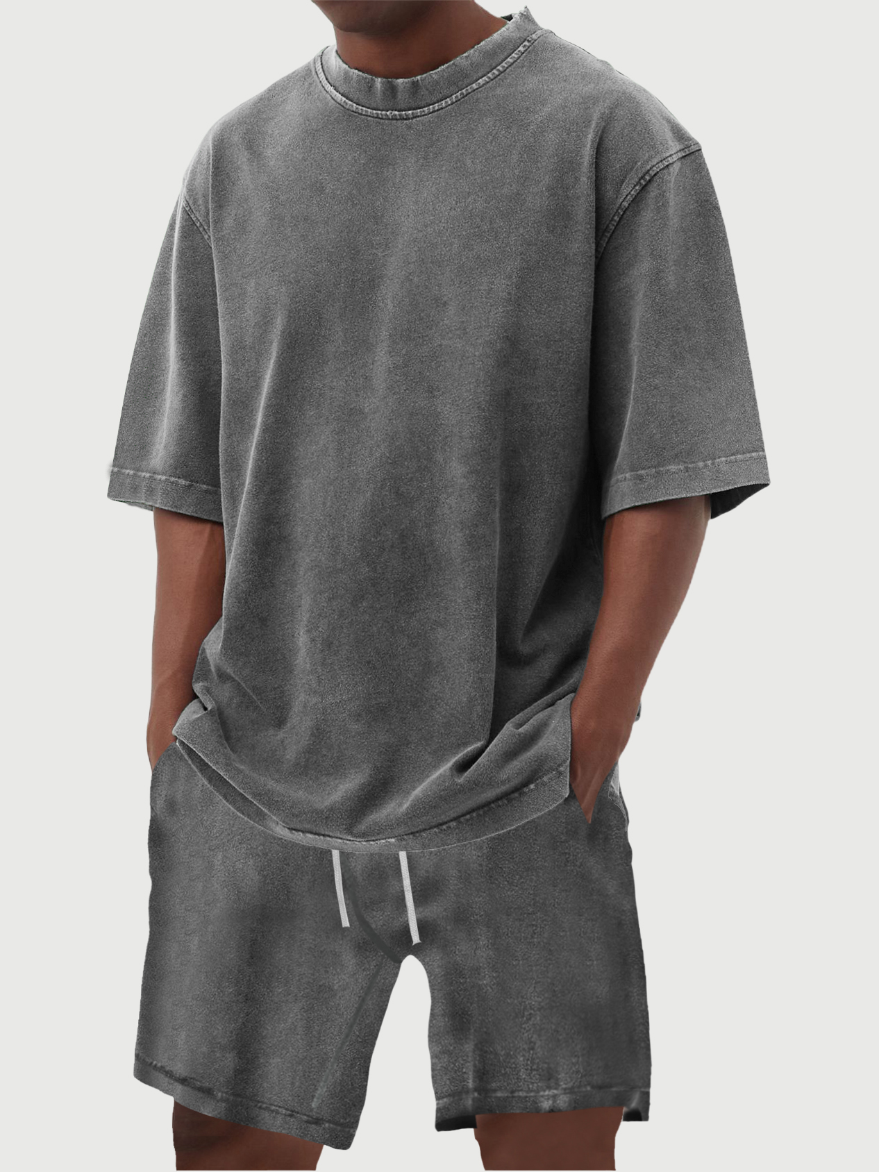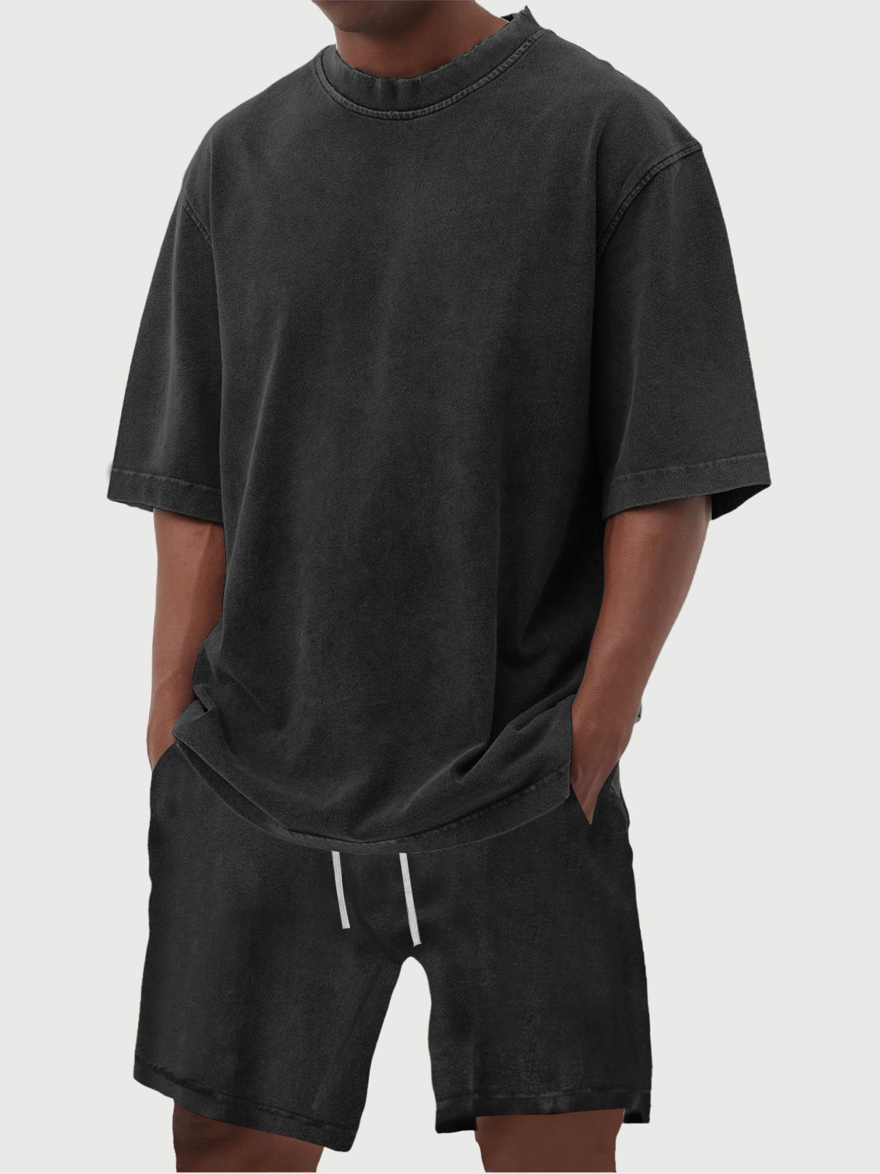 Men's 100% Cotton Vintage Distressed Washed Short Sleeved T-shirt Shorts Set