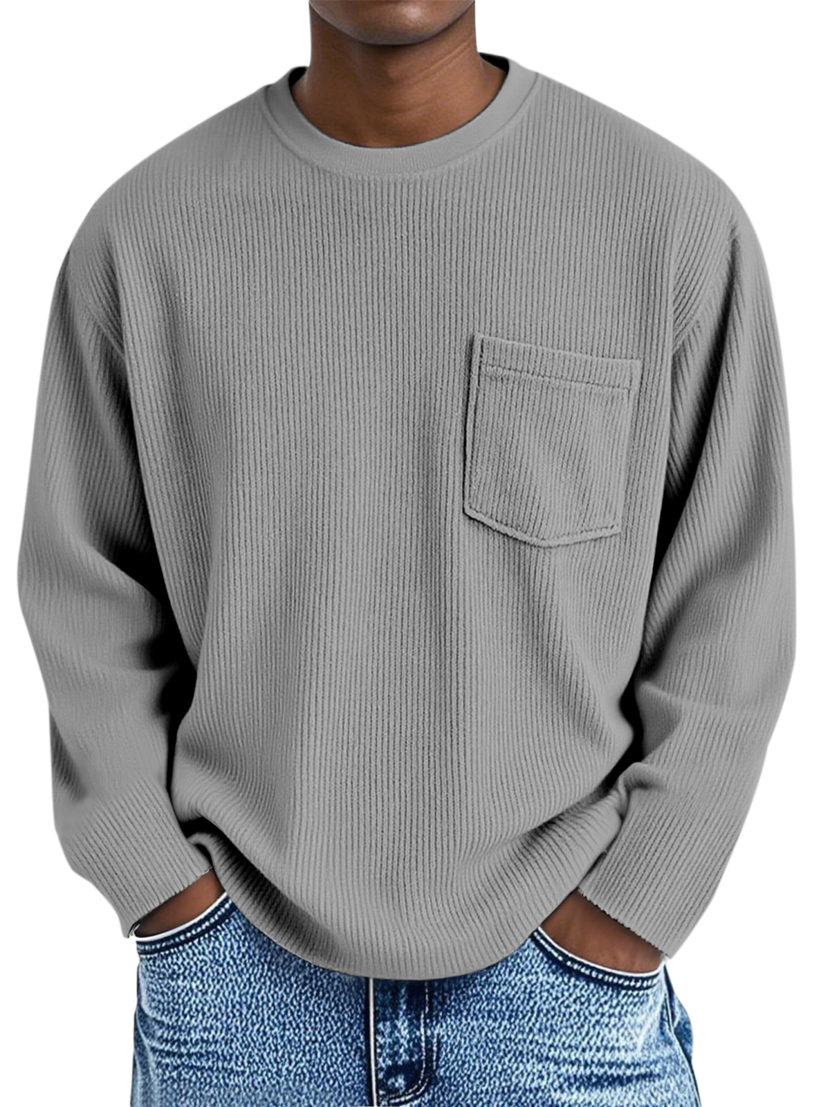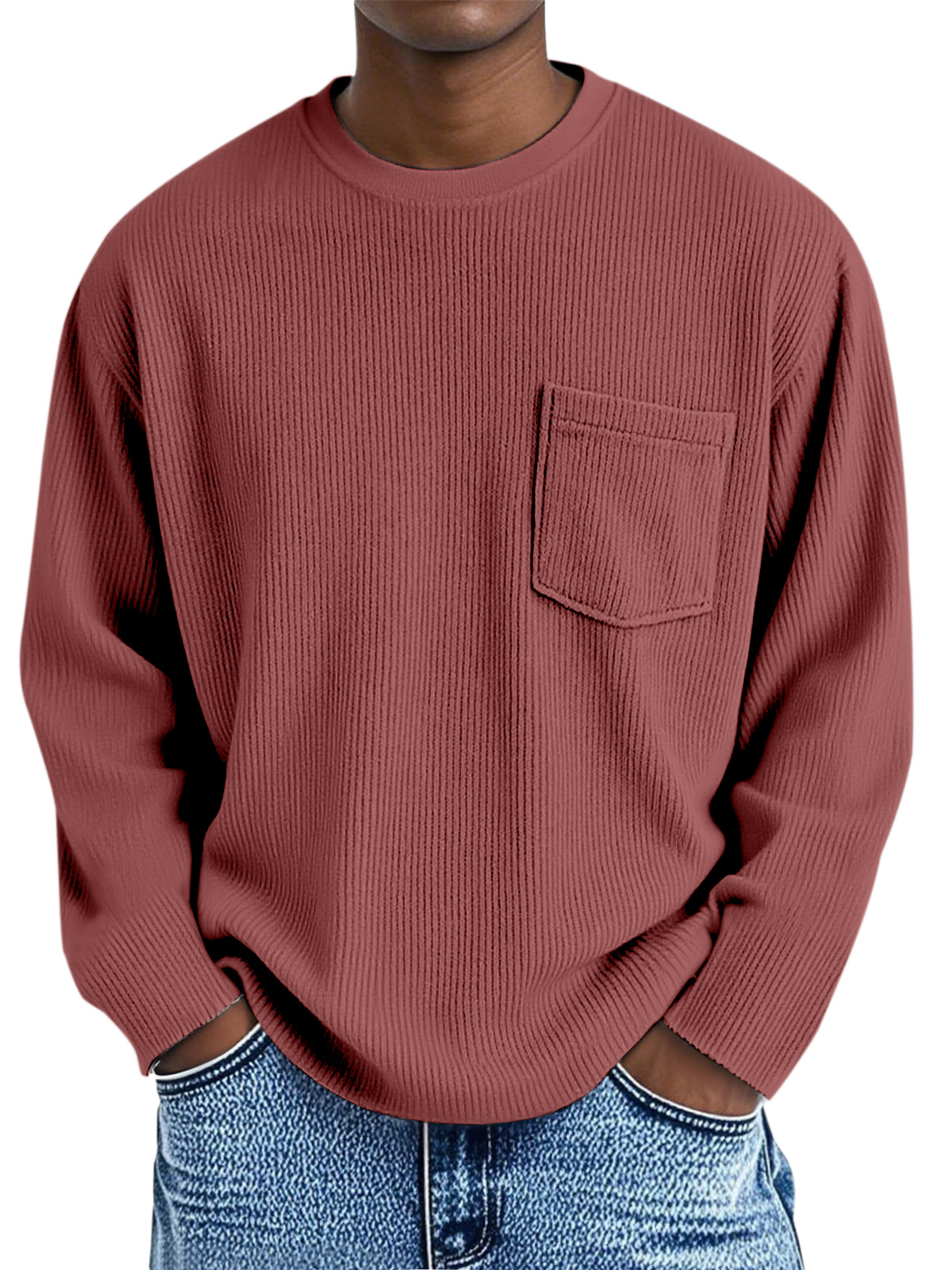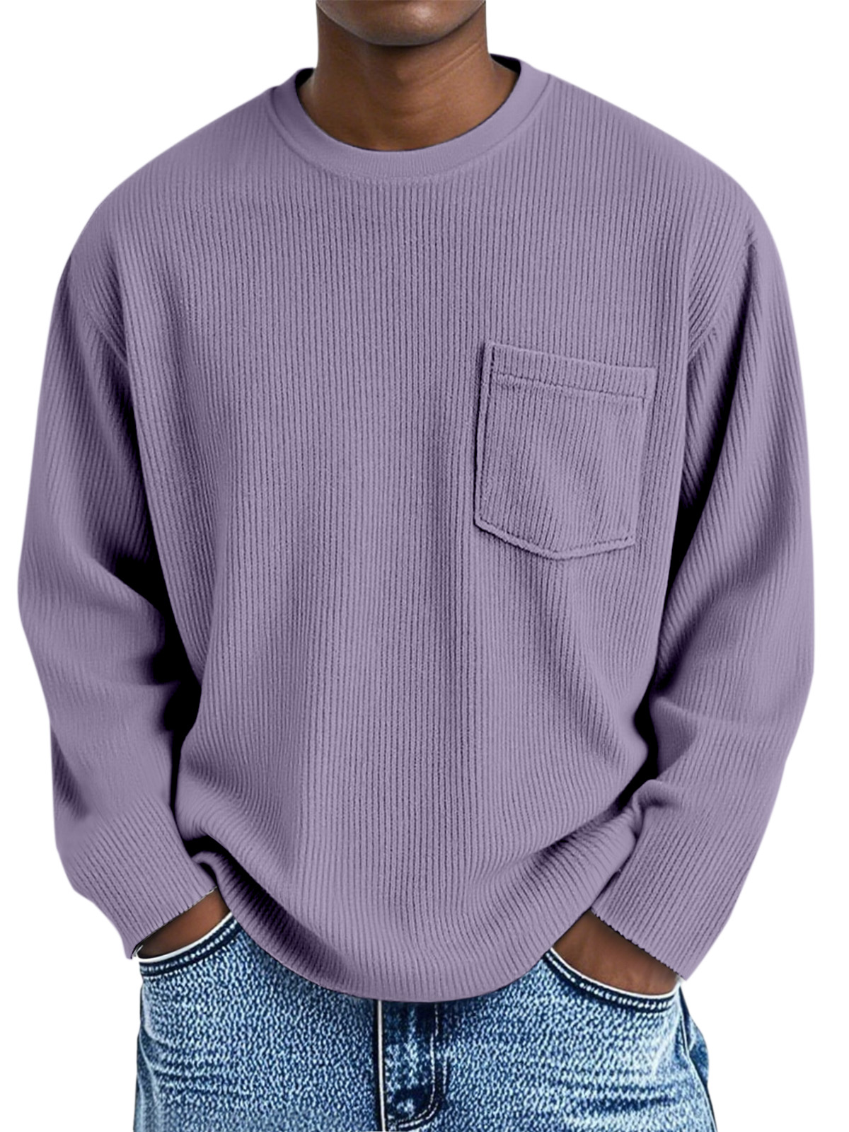 Men's Daily Simple Solid Color Vertical Pit Strip Pocket Round Neck Long-sleeved T-shirt