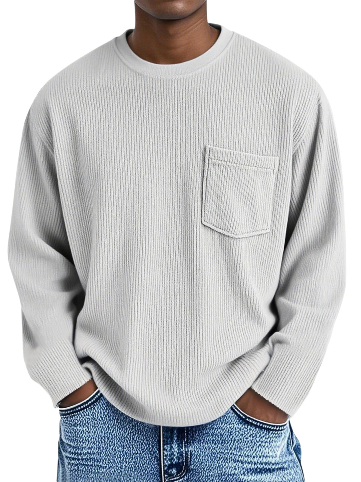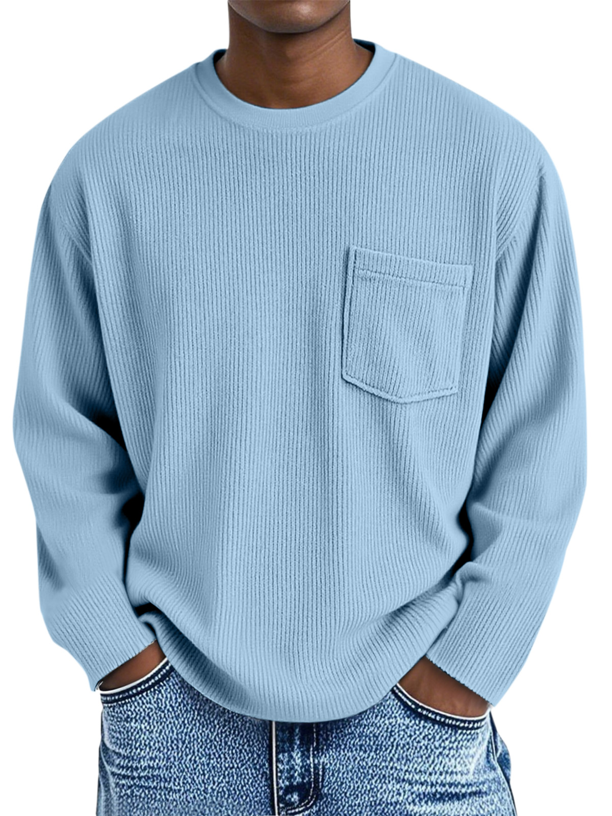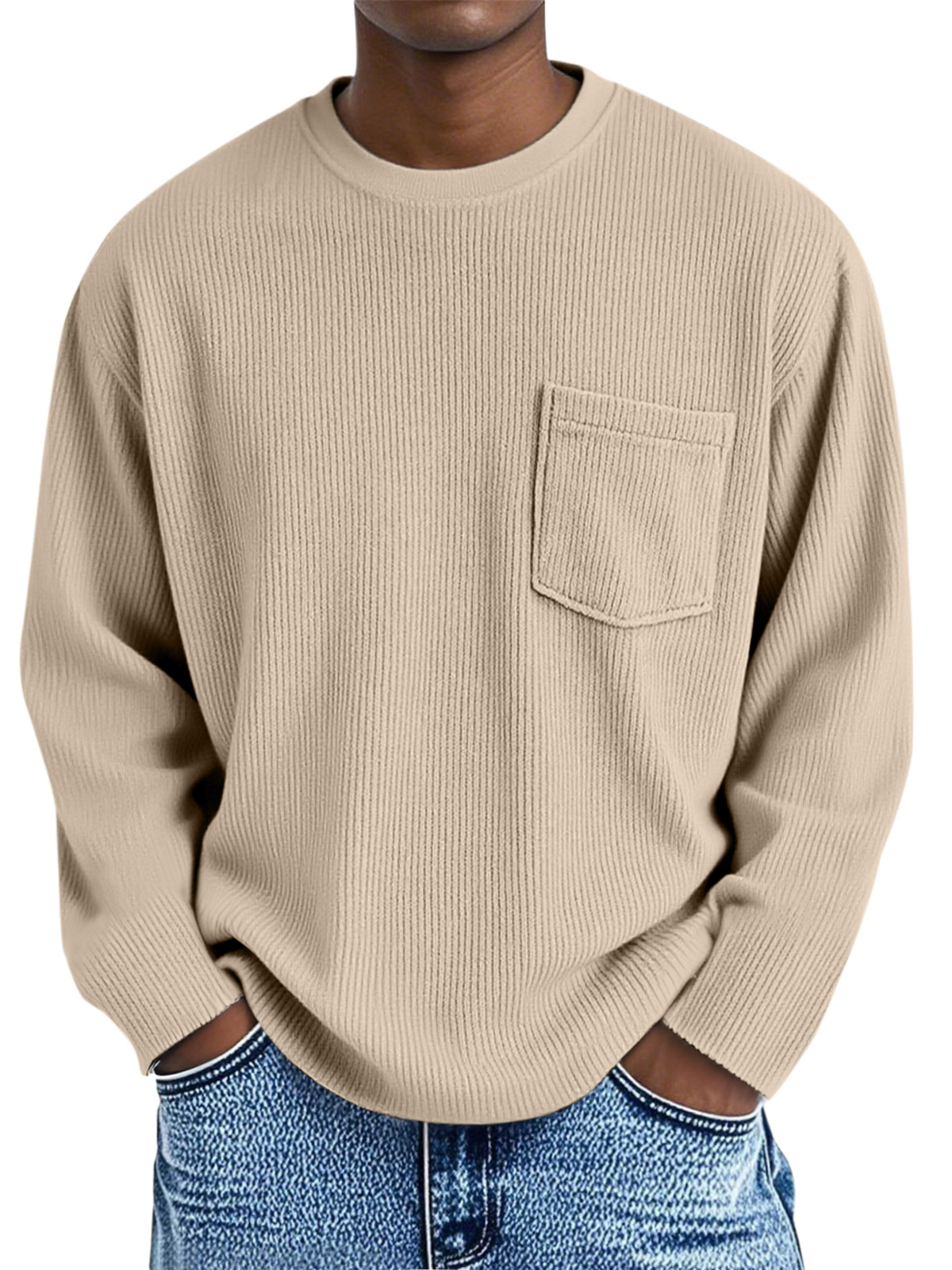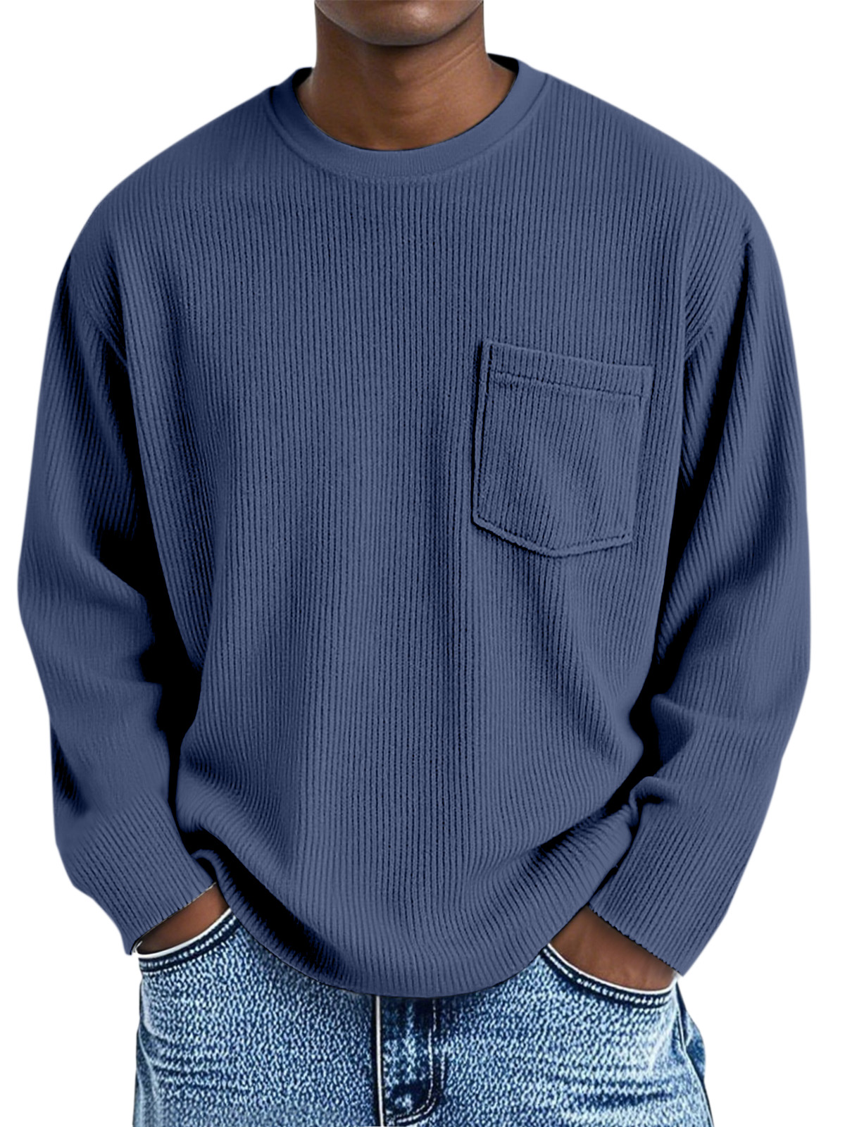 Men's Daily Simple Solid Color Vertical Pit Strip Pocket Round Neck Long-sleeved T-shirt