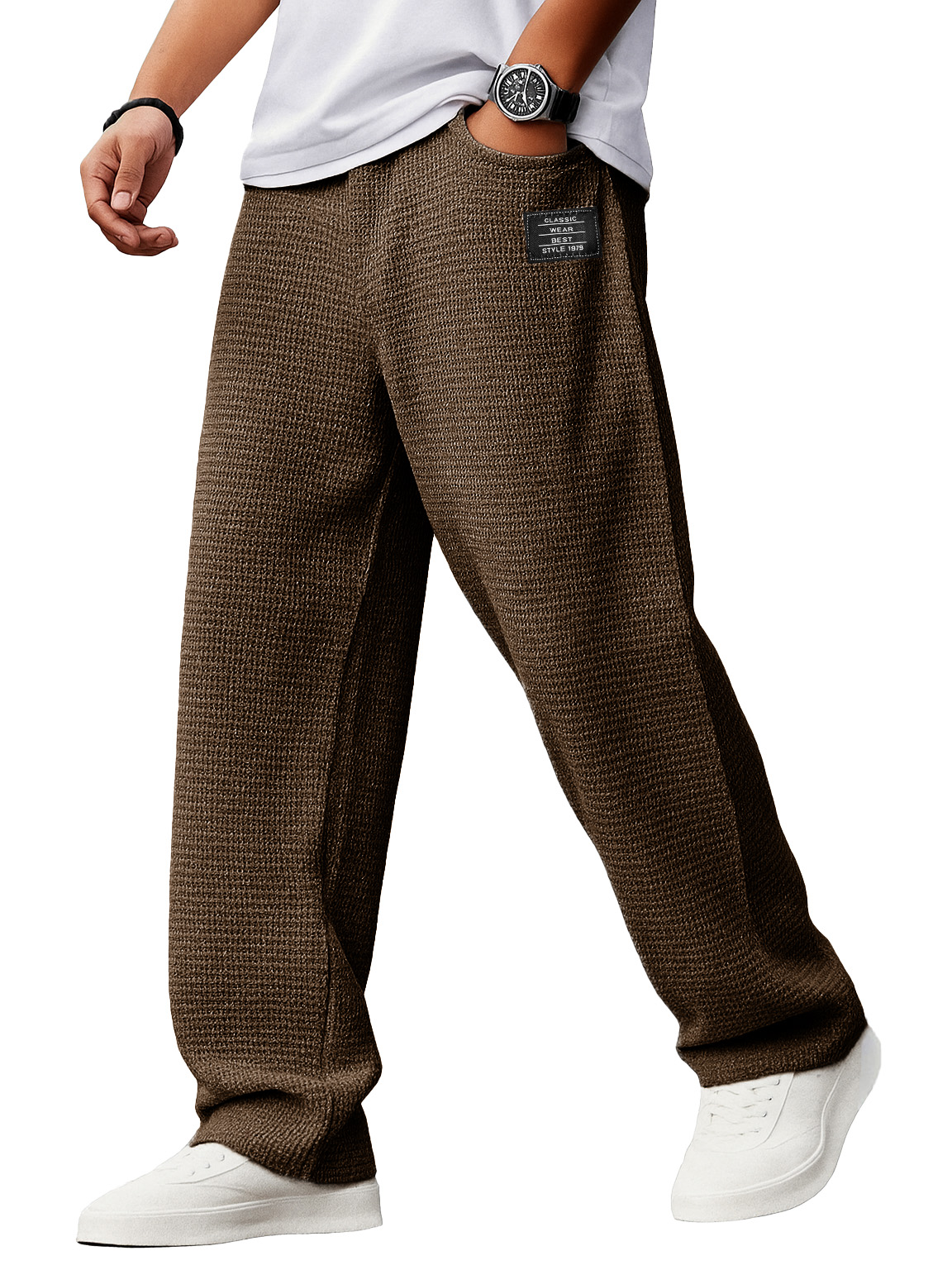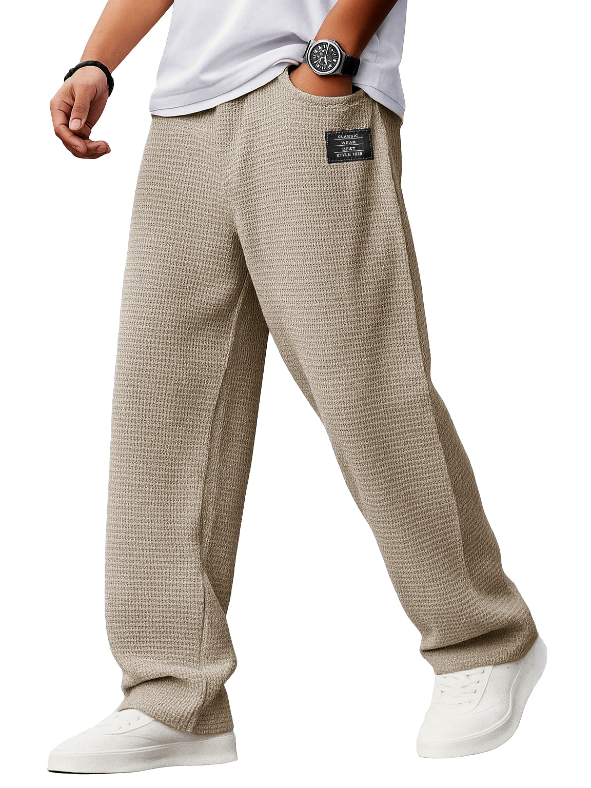 Men's Stylish Everyday Waffle Fabric Pants With Loose-fitting Drawstring Waist And Embroidered Logo